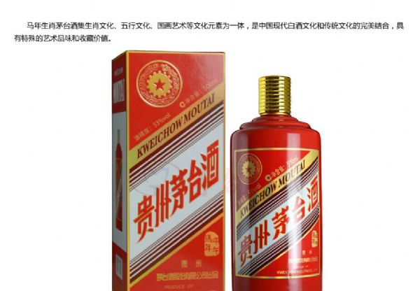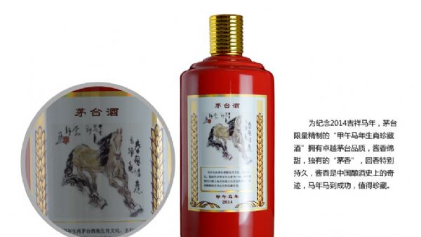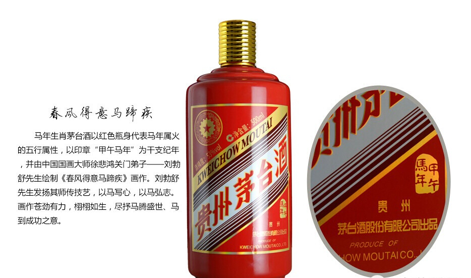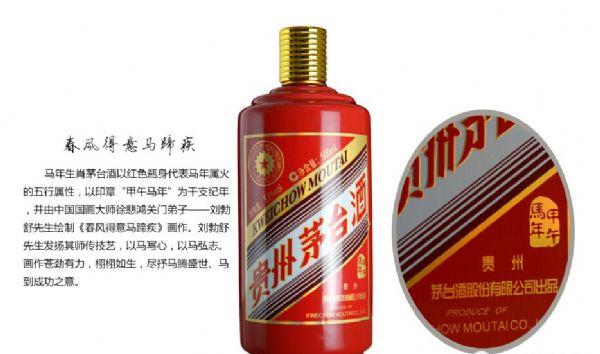 馬年生肖茅臺酒以紅色瓶身代表馬年屬火的五行屬性,以印章“甲午馬年”為干支紀(jì)年,并由中國國畫大師徐悲鴻關(guān)門弟子--劉勃舒先生繪制《春風(fēng)得意馬蹄疾》畫作。劉勃舒先生發(fā)揚(yáng)其師傳技藝,以馬寫心,以馬弘志。畫作蒼勁有力,栩栩如生,盡抒馬騰盛世、馬到成功之意。