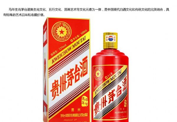 馬年生肖茅臺(tái)酒集生肖文化、五行文化、國畫藝術(shù)等文化元素為一體,是中國現(xiàn)代白酒文化和傳統(tǒng)文化的完美結(jié)合,具有特殊的藝術(shù)品味和收藏價(jià)值。