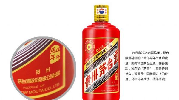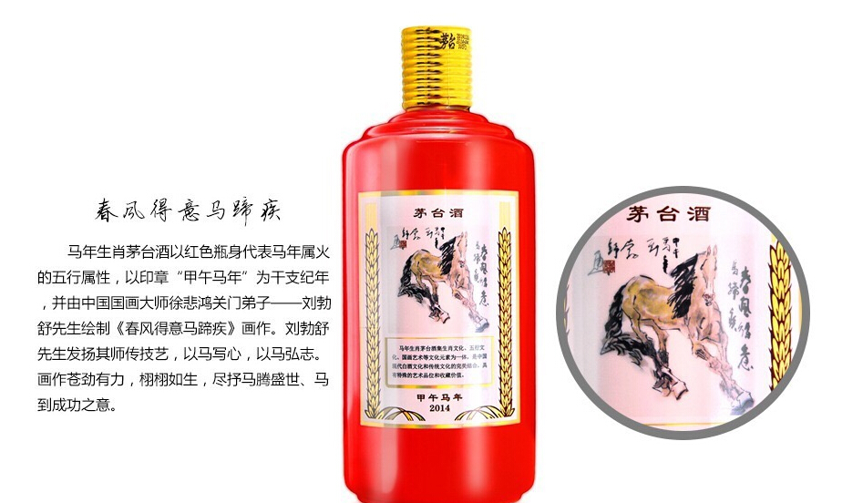 馬年生肖茅臺(tái)酒以紅色瓶身代表馬年屬火的五行屬性,以印章“甲午馬年”為干支紀(jì)年,并由中國國畫大師徐悲鴻關(guān)門弟子--劉勃舒先生繪制《春風(fēng)得意馬蹄疾》畫作。