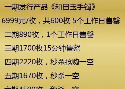 便可獲得下一期配送原始股的資格。(越早完成打量,越早獲得配額資格)。截至目前為止,和田碧玉手鐲已經(jīng)發(fā)售了6期,情況如下: