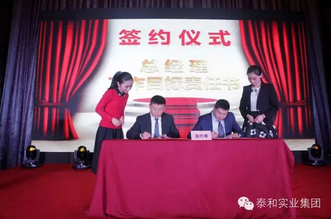 大會進行了泰和集團2016年工作目標責任書簽訂儀式,董事長分別與總經(jīng)理及茅臺酒負責人簽訂了工作目標責任書;總經(jīng)理分別與集團職能板塊:行政部、財務(wù)部、法務(wù)部,業(yè)務(wù)板塊:藥材交易中心、貿(mào)易、金融、格欽樓餐飲、物業(yè)各板塊負責人簽訂工作目標責任書,明確了2016年集團各部門工作目標。