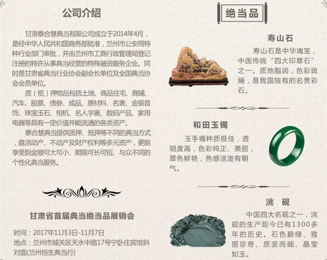 此次展銷會有全省和北京、深圳等二十多家企業(yè)積極響應參展,展品大到房屋、車輛,小到黃金飾品、名表、字畫、文玩等。甘肅泰合慧典當有限公司本次展品包含絕當商鋪和房屋、中國傳統(tǒng)“四大印章石”之一的壽山石、種質極佳的和田玉鐲、中國四大名硯之一的洮硯。