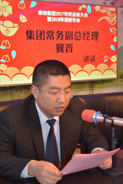 集團(tuán)董事長張建忠致新春賀詞,他表示2017年是不平凡的一年,面對(duì)國家政策調(diào)控、銀行緊縮貸款等不利因素的影響下,在各位領(lǐng)導(dǎo)和大家的共同努力下,度過了這艱難的一年。2018年經(jīng)濟(jì)形勢(shì)將更加嚴(yán)峻,我真心地希望大家能夠珍惜泰和集團(tuán)給予我們的這個(gè)平臺(tái),在這個(gè)平臺(tái)上使大家能夠充分體現(xiàn)出自我價(jià)值,去付出自己的真誠和努力,去成就已有的事業(yè)和學(xué)識(shí)。過去的一年公司在保證原有業(yè)務(wù)持續(xù)發(fā)展的同時(shí),也在逐步嘗試開展新的業(yè)務(wù)。新的一年,我們要加強(qiáng)國際貿(mào)易和國內(nèi)貿(mào)易,通過組建優(yōu)秀的貿(mào)易團(tuán)隊(duì),再結(jié)合自身的石油化工實(shí)體業(yè)務(wù),與大型國企和上市公司進(jìn)行合作,爭(zhēng)取取得更好的成績(jī)。