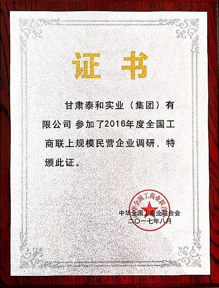甘肅泰和實業(yè)集團有限公司被中華全國工商業(yè)聯(lián)合會列為2016年度上規(guī)模民營企業(yè)調(diào)研單位