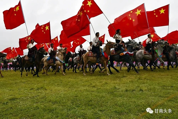 上午10時許,隨著高云龍宣布第二十屆九色甘南香巴拉旅游藝術(shù)節(jié)開幕,由千匹駿馬、千名騎手組成的馬隊如騰飛的巨龍一般從主席臺前飛馳而過,象征著偉大祖國從站起來、富起來到強起來光輝歷程的71面五星紅旗在會場迎風(fēng)飄揚……