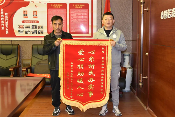 為響應(yīng)“萬(wàn)企興萬(wàn)村”蘭州行動(dòng)村企結(jié)對(duì)興村工作,集團(tuán)領(lǐng)導(dǎo)深入永登縣兌角村考察調(diào)研,詳細(xì)了解該村亟待解決的困難。在了解到該村農(nóng)田灌溉難問(wèn)題后,捐款3萬(wàn)元人民幣用于該村農(nóng)業(yè)灌溉井施工項(xiàng)目。12月29日,兌角村黨支部書(shū)記、村委會(huì)主任趙發(fā)軍一行2人,為泰和集團(tuán)送來(lái)了一面寫(xiě)有“心系村民辦實(shí)事 愛(ài)心捐助暖人心”的錦旗,對(duì)泰和集團(tuán)的善舉表示感謝。